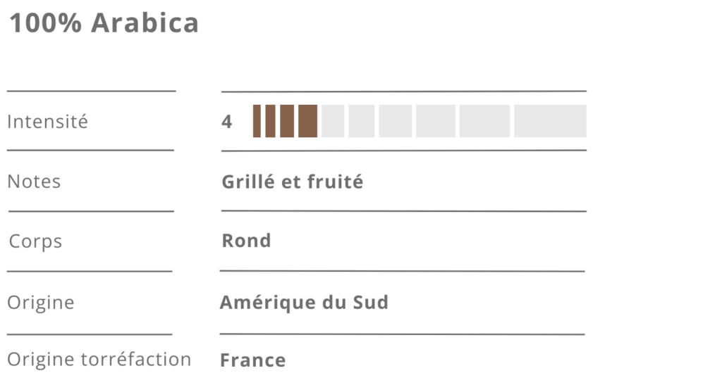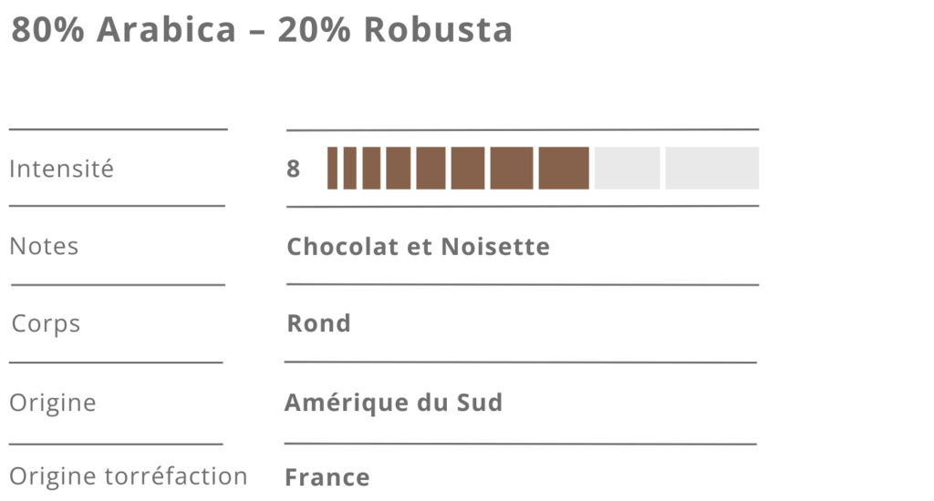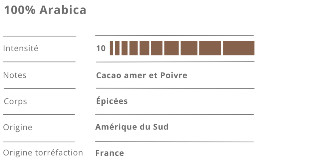 Un expresso de caractère, pensé pour celles et ceux qui aiment les cafés intenses. Ce mélange révèle une base toastée et généreuse, relevée par une amertume élégante de cacao et une pointe poivrée qui vient signer la finale. En tasse, c’est profond, vibrant, presque épicé — un café “terre” qui accroche le palais et laisse une trace. Parfait en expresso pour profiter de toute sa puissance, il fonctionne aussi à merveille en cappuccino ou dans toutes vos boissons à base de lait, où ses notes corsées restent bien présentes.